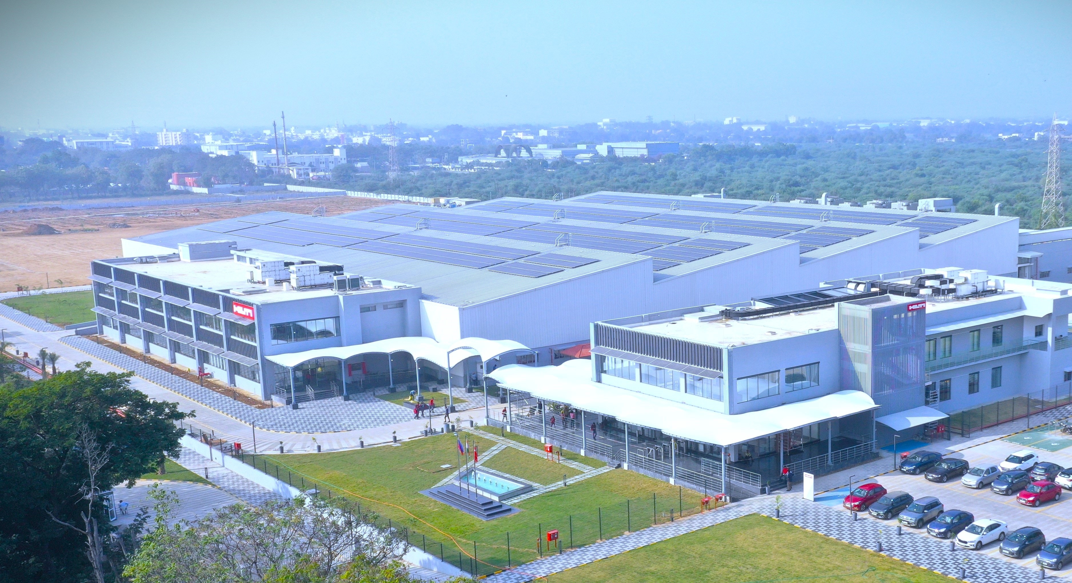 In Vadodara, India, Hilti's plant and multipurpose building both received the Gold Rating from DGNB. Notably, this marks the first time a building in India has achieved this esteemed rating. The production plant features a highly flexible design to optimize space utilization and includes a soundproof testing lab and a pilot plant. The highly energy efficient heating, ventilation and air-conditioning system, with chilled beams and radiant floor cooling, ensures optimal working conditions. The campus features rainwater harvesting and treatment systems for 100% water recycling, a photovoltaic system with 1500 MWh, charging stations for electric vehicles, bicycle parking and a Miyawaki forest that promotes biodiversity and covers 25 percent of the plant's total surface area.